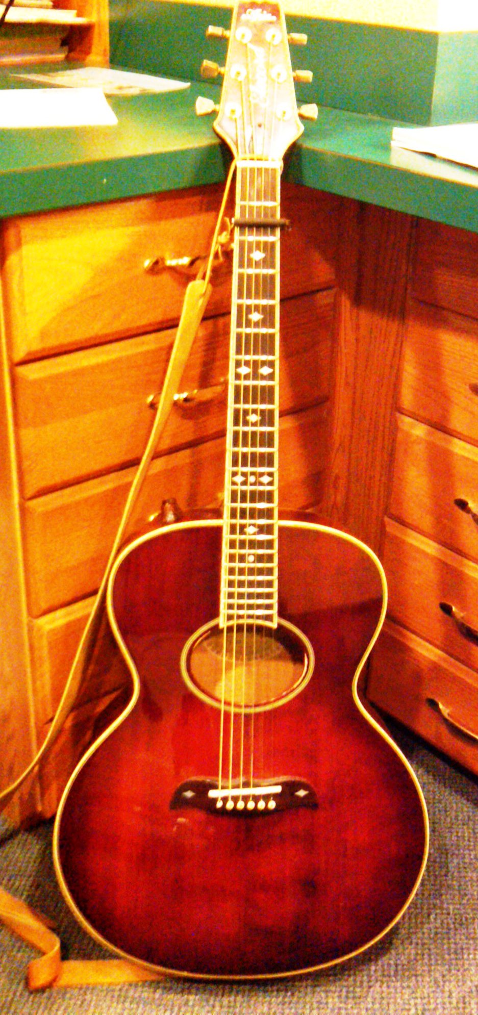 A few fine acoustic instruments came my way in those years, notably a Guild D25. I loved that thing. I think I sold it for rent money. I regret that. I bought an Aria Elecord in 1981. It was an early model from a small Japanese maker who later became quite large and successful, mostly by making guitars by subcontract for other brands. It’s seasoned nicely over the years.